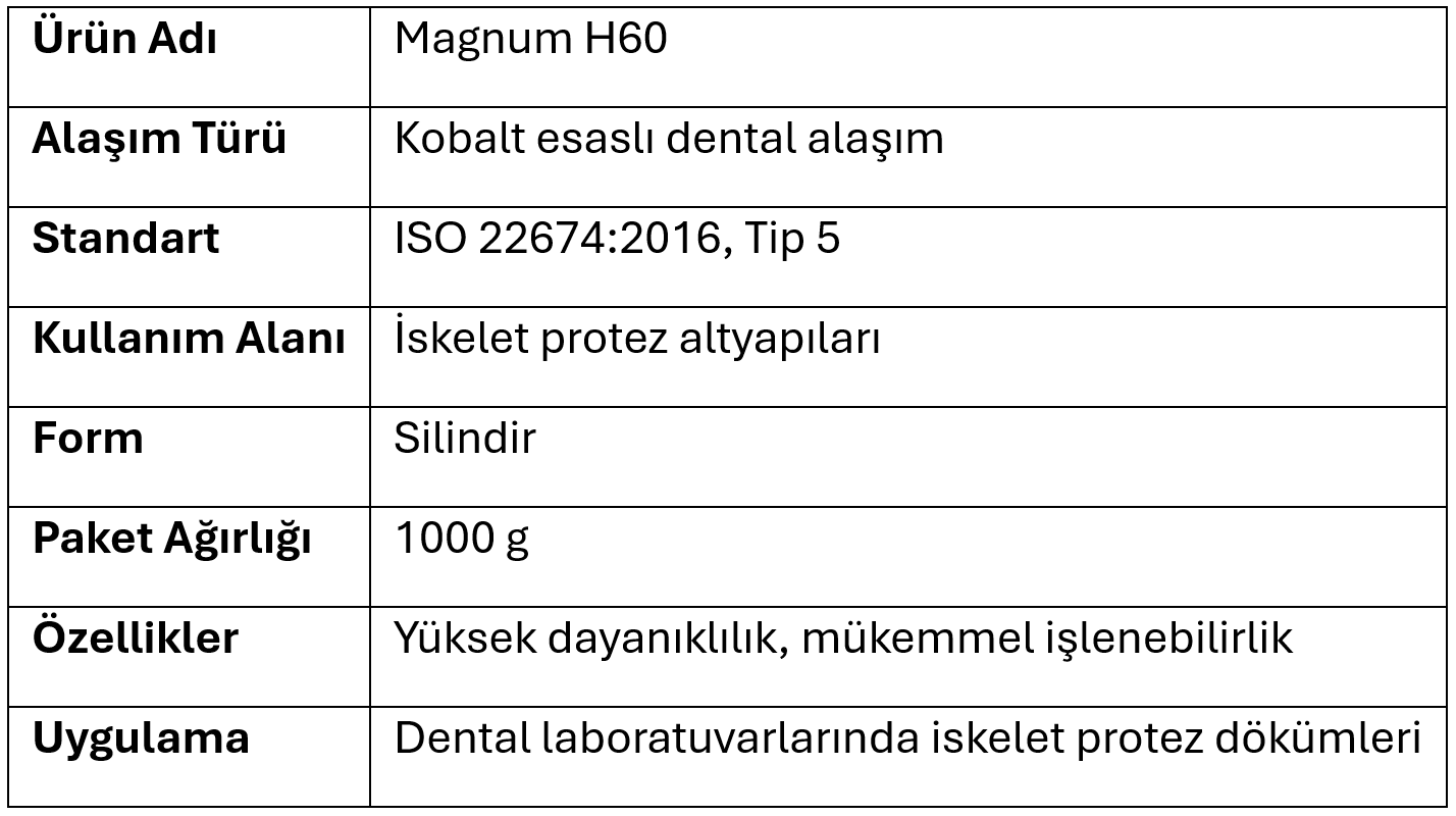 Magnum H60, iskelet protez uygulamaları için özel olarak geliştirilmiş, ISO 22674:2016 standardına uygun kobalt esaslı dental alaşımdır (Tip 5). Yüksek dayanıklılığı ve mükemmel işlenebilirliği sayesinde, iskelet protez üretiminde güvenilir bir performans sunar.