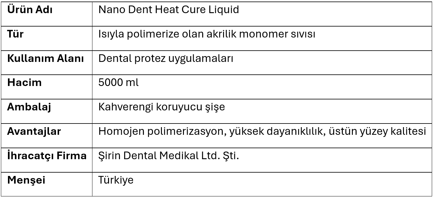 Nano Dent Heat Cure Liquid, ısı ile polimerize olan akrilik esaslı protez uygulamaları için özel olarak geliştirilmiş yüksek kaliteli bir monomer sıvıdır. Dental laboratuvarların günlük üretim süreçlerinde güvenilir ve stabil bir performans sunarak, protezlerin mükemmel fiziksel özelliklere sahip olmasına katkı sağlar.