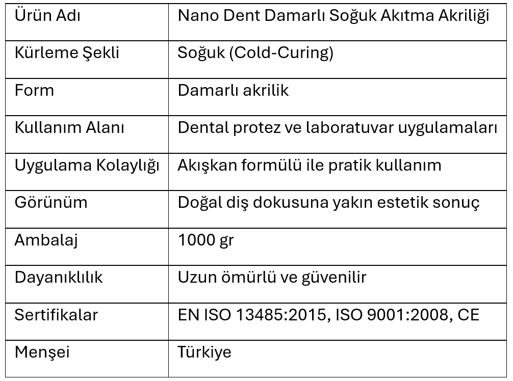 Nano Dent Damarlı Soğuk Akıtma Akriliği, dental laboratuvar uygulamalarında yüksek performans ve estetik sonuç sunmak için geliştirilmiştir. Damarlı yapısı sayesinde doğal görünüme yakın protezler elde edilmesine olanak tanırken, özel formülüyle kolay akış ve pratik kullanım sağlar.