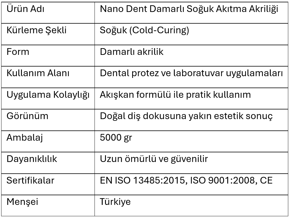Nano Dent Damarlı Soğuk Akıtma Akriliği, dental laboratuvar uygulamalarında yüksek performans ve estetik sonuç sunmak için geliştirilmiştir. Damarlı yapısı sayesinde doğal görünüme yakın protezler elde edilmesine olanak tanırken, özel formülüyle kolay akış ve pratik kullanım sağlar.