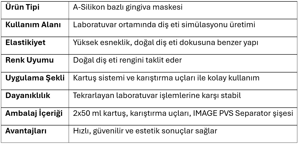 IMAGE PVS Gingi Mask, laboratuvar ortamında gerçeğe en yakın diş eti simülasyonunu elde etmek için geliştirilmiş A-silikon bazlı bir üründür. Yüksek elastikiyeti sayesinde implant ve protez çalışmalarında doğal diş eti dokusunun hareketlerini doğru şekilde taklit eder.
