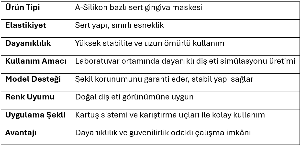 IMAGE PVS Gingi Mask Hard, laboratuvar ortamında dayanıklı ve uzun ömürlü diş eti simülasyonları oluşturmak için geliştirilmiş A-silikon bazlı bir üründür. Sert yapısı sayesinde özellikle implant ve protez çalışmalarında daha stabil bir model desteği sağlar.