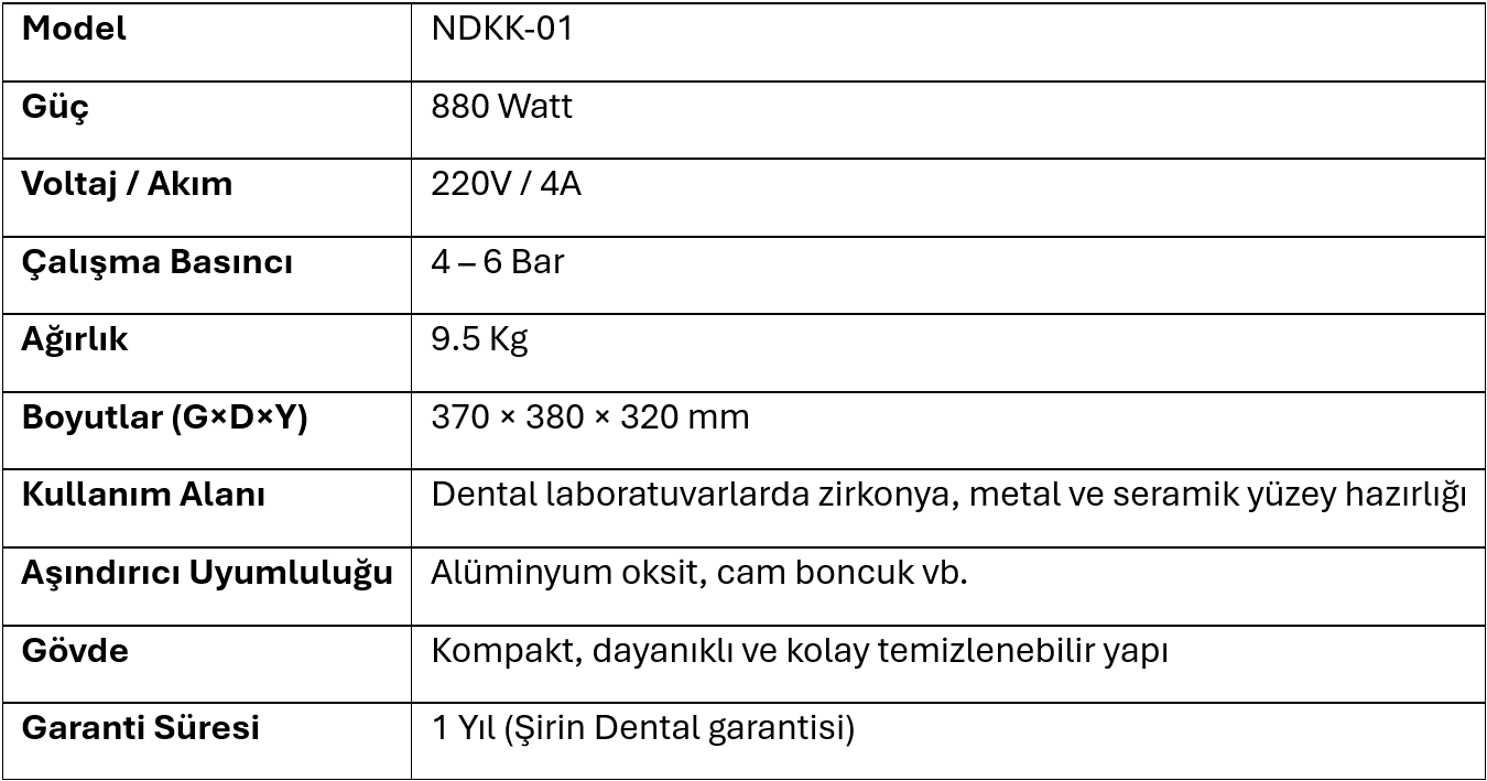 Şirin Dental Kaba Kumlama Cihazı, dental laboratuvarlarda zirkonya, metal ve seramik yüzeylerin hızlı ve etkili şekilde hazırlanması için özel olarak geliştirilmiş profesyonel bir çözümdür. Ayarlanabilir basınç sistemi ve yüksek performanslı kumlama teknolojisi sayesinde porselen, kompozit ve yapıştırıcı uygulamalarında mükemmel tutunma yüzeyleri elde edilmesini sağlar. Çeşitli dental uyumlu aşındırıcı malzemeler (alüminyum oksit, cam boncuk vb.) ile çalışabilen cihaz, kompakt tasarımıyla laboratuvarlara kolayca entegre olurken, kullanıcı dostu yapısıyla günlük işlemleri hızlandırır ve kolaylaştırır.
