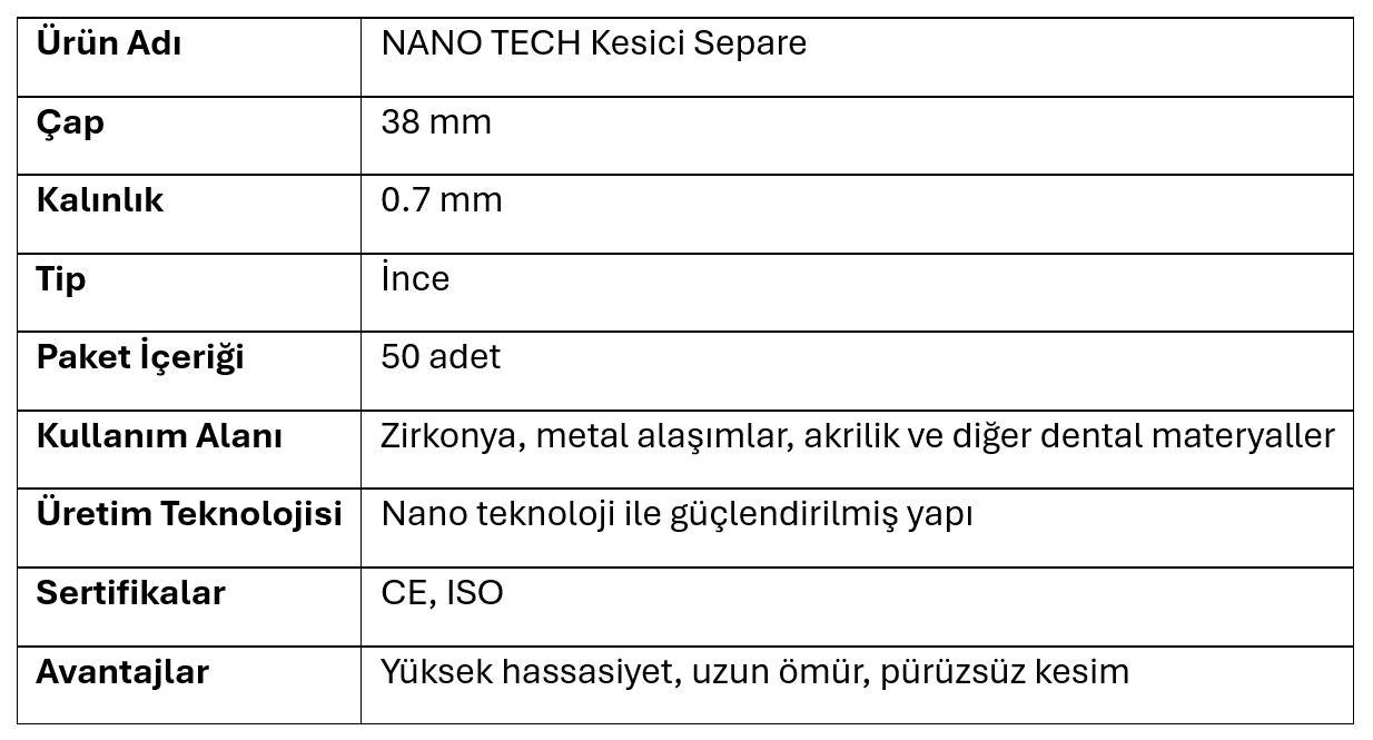 NANO TECH Kesici Separe (38×0.7 mm) – İnce – 50 Adet, diş teknisyenleri ve laboratuvar profesyonelleri için özel olarak tasarlanmış yüksek performanslı kesim diskleridir. 38 mm çap ve 0.7 mm inceliği ile hassas ve detaylı kesimlerde üstün performans sunar. Yenilikçi nano teknoloji üretim süreci sayesinde dayanıklılığı artırılmış, uzun ömürlü bir kullanım sağlar. Zirkonya, metal alaşımlar, akrilik ve diğer dental materyaller üzerinde temiz, hızlı ve pürüzsüz kesimler yaparak iş süreçlerinizi kolaylaştırır. 50 adetlik ekonomik paket içeriği, laboratuvarınızın ihtiyaçlarını uzun süre karşılayacak şekilde hazırlanmıştır.