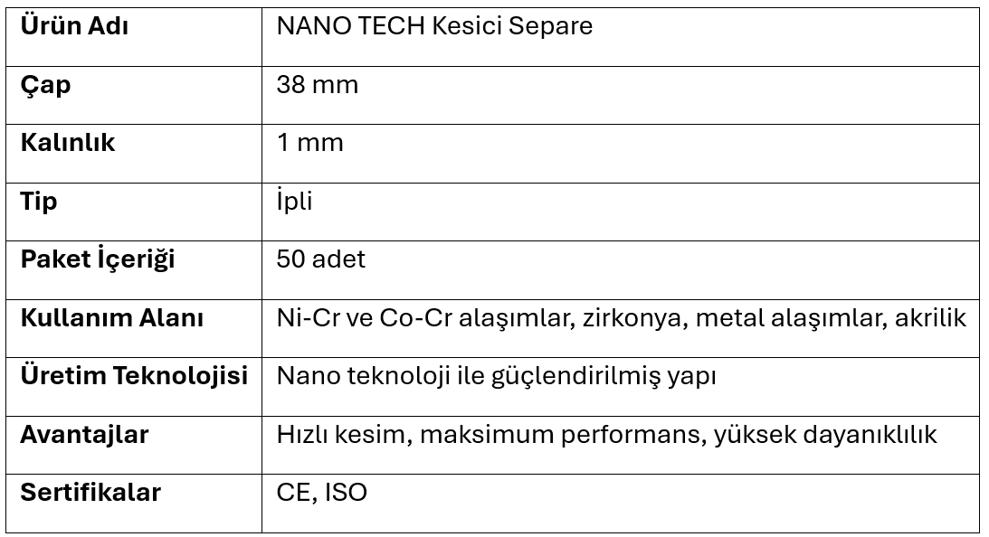 NANO TECH Kesici Separe, laboratuvar uygulamalarında hızlı kesim ve maksimum performans için geliştirilmiş yüksek kaliteli ayırma diskleridir. 38 mm çap ve 1 mm kalınlığa sahip bu özel tasarım diskler, Ni-Cr ve Co-Cr alaşımlarının yanı sıra zirkonya, metal ve akrilik gibi çeşitli dental materyallerin kesiminde üstün sonuç verir. İpli yapısı sayesinde kesim sırasında ekstra dayanıklılık sağlar, güvenliği artırır ve uzun ömürlü kullanım sunar. 50 adetlik paket içeriğiyle yoğun laboratuvar kullanımı için idealdir.