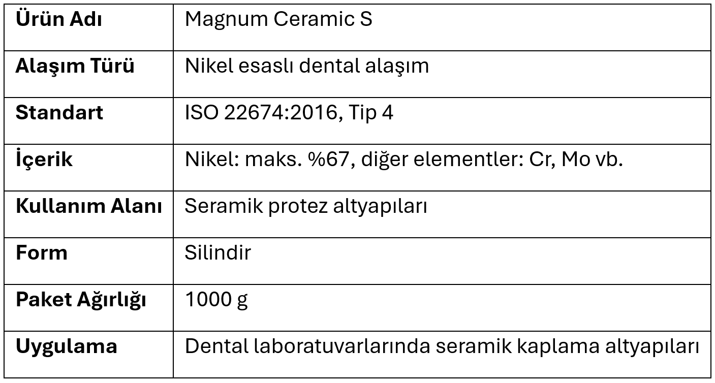 Magnum Ceramic S, seramik protez uygulamaları için özel olarak geliştirilmiş, ISO 22674:2016 standardına uygun nikel esaslı dental alaşımdır (Tip 4). Yüksek dayanıklılığı ve maksimum %67 oranında nikel içeriğiyle, seramik kaplamalar için mükemmel bir altyapı sağlar.