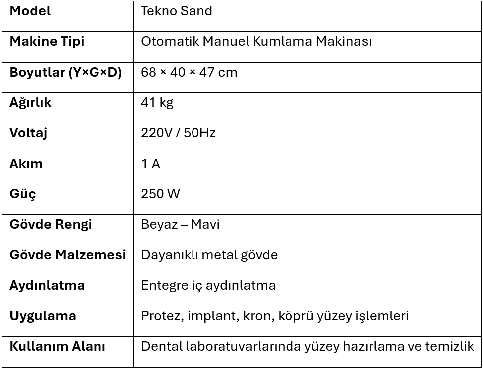 Gelişmiş otomatik kontrol sistemi ile işlem süresi kısalır, ergonomik tasarımı ve entegre toz kontrol sistemi sayesinde temiz ve güvenli bir çalışma ortamı oluşturur. Oksit, kalıntı ve kirlerin hızlı şekilde giderilmesini sağlayarak restorasyonların daha kaliteli ve dayanıklı olmasına katkı sağlar. Otomatik kumlama makineleri ile hassas, hızlı ve güvenli yüzey işlemleri artık çok daha kolay.