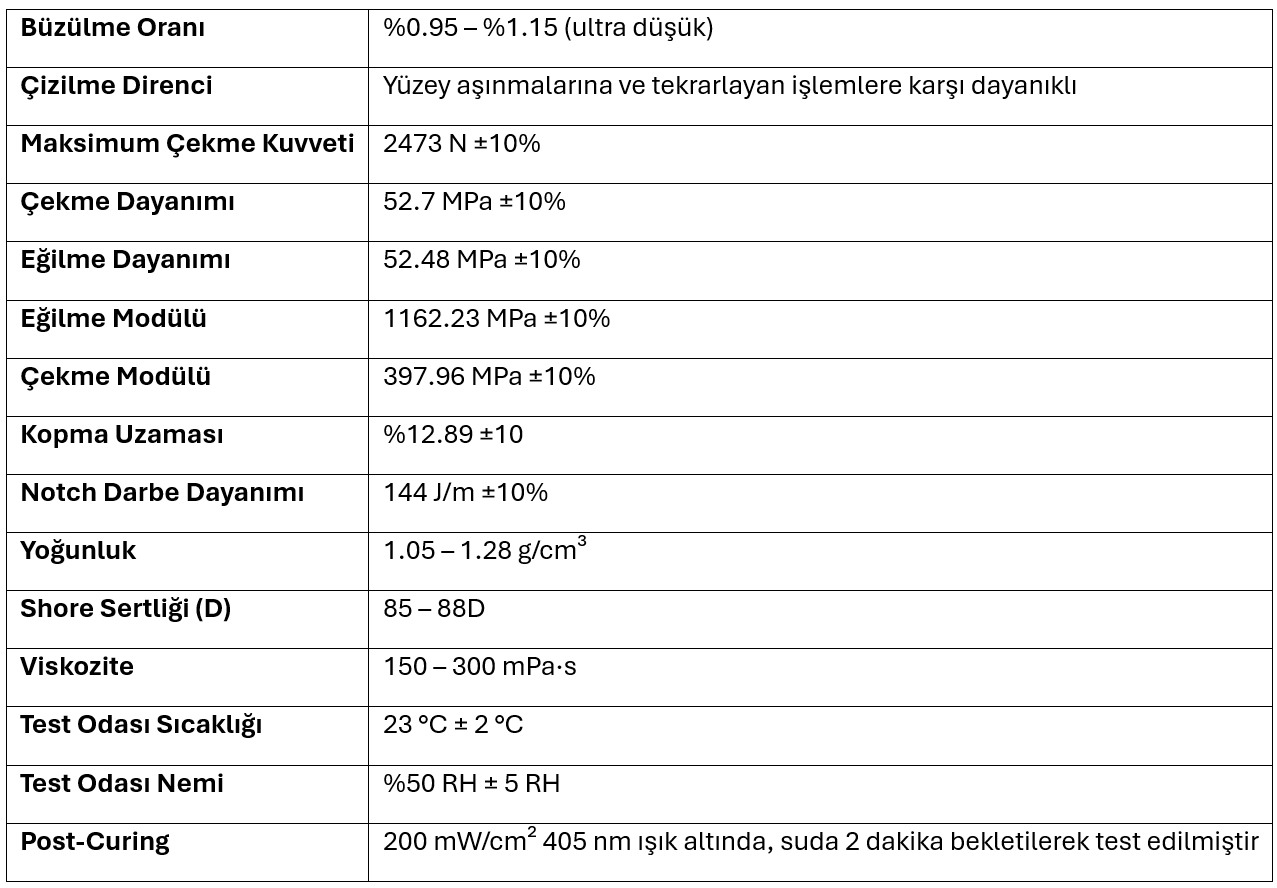 Geliştirilmiş formülü sayesinde üretilen dental modeller, hem hassas ölçü uyumu hem de uzun süreli kullanımda yüzey dayanıklılığı sağlar. Ultra düşük büzülme oranı (%0.95–1.15) sayesinde, implant ve onarım modellerinde deformasyon riskini ortadan kaldırır. Aynı zamanda toksik olmayan ve düşük koku özelliğiyle laboratuvar ortamında güvenle kullanılabilir.